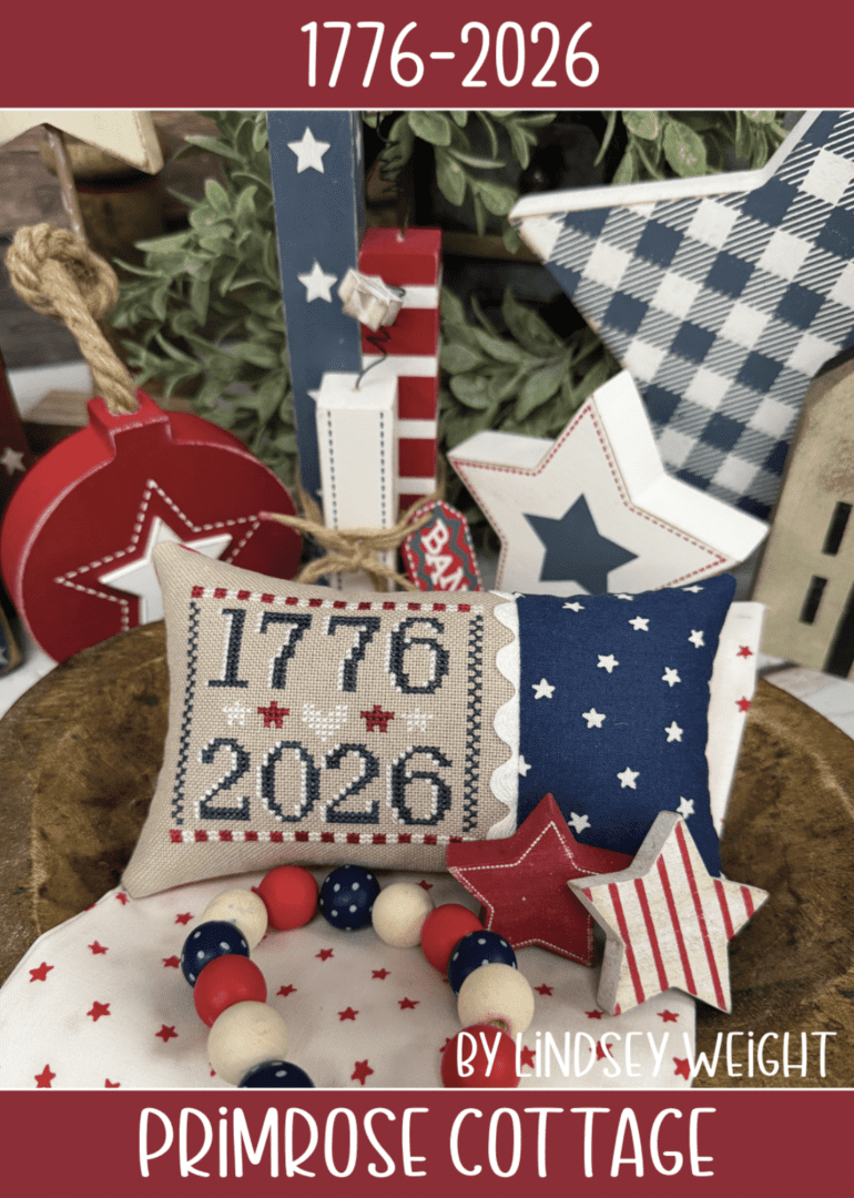1776-2026 by Primrose Cottage Stitch Count: 48w x 42h Thread used: CCT Blacksmith Blue and Caroling, DMC 5200 DMC conversion included