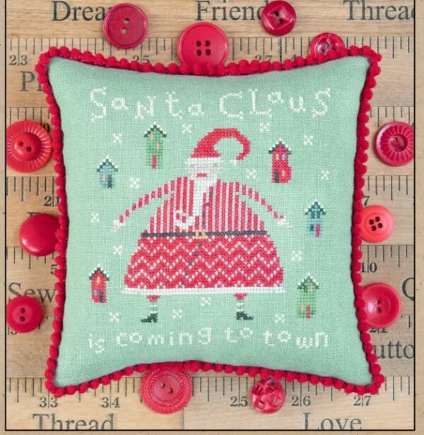 This is a fun Santa. Do you know how I can tell? He has birdhouses with stitches missing and extra stitches added, he has a couple of missing stitches in the fur trim of his coat, and it doesn’t seem to bother him in the least. He’s on his way in to town for some fun!